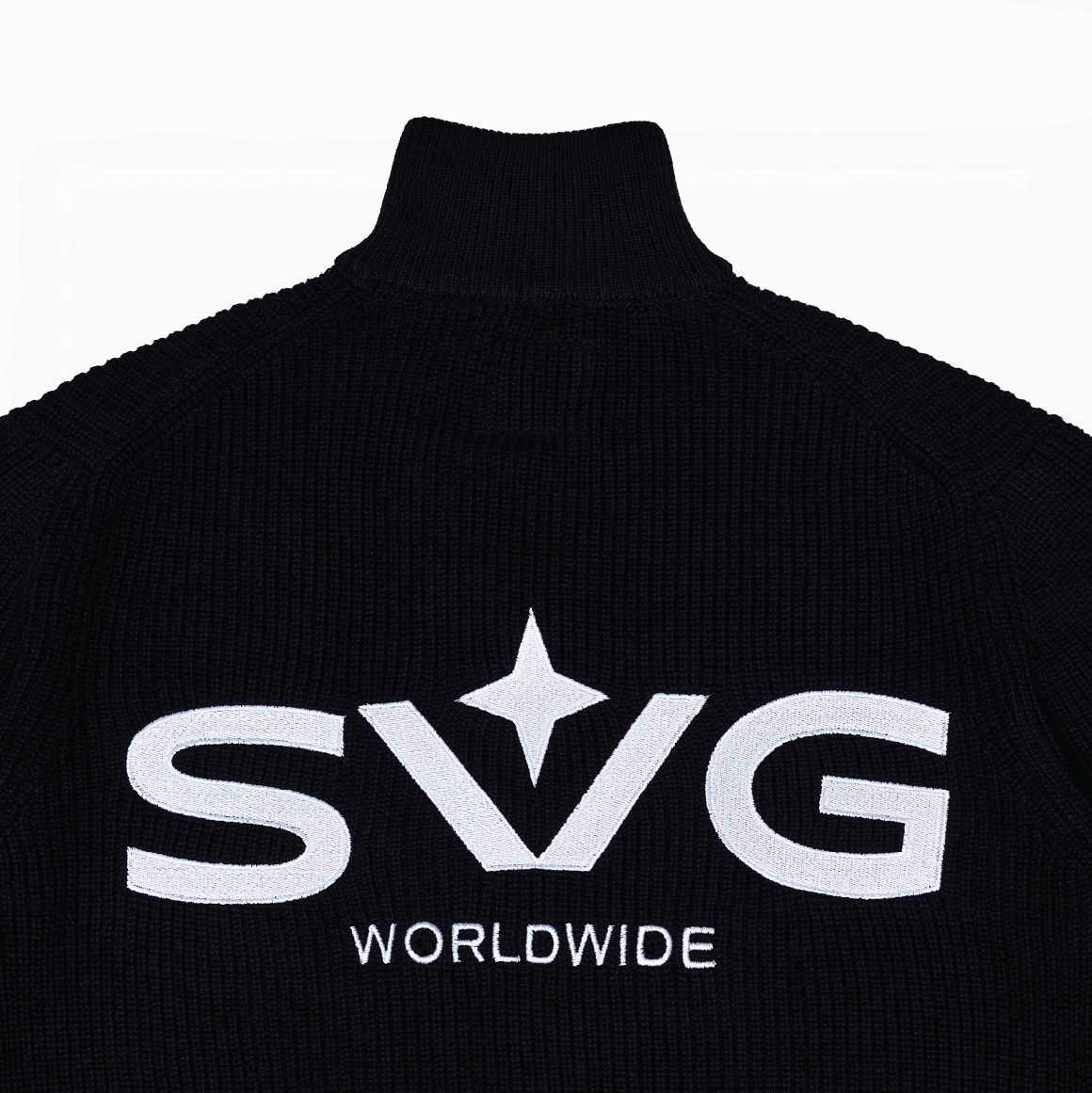 The SS26 Knitted Half Zipper fuses 20/S cotton knit with statement back embroidery and a custom zip logo, offered in Black, Grey, and Baby Blue.
