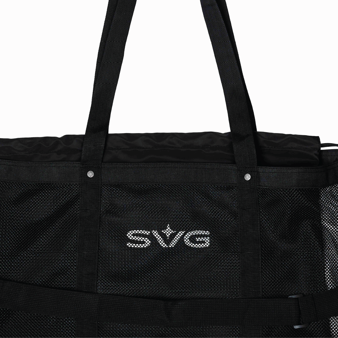The SS26 Mesh Totebag is crafted from 1000D polyester canvas with mesh panels and tape detailing, featuring a removable inner bag with screen-printed logos.