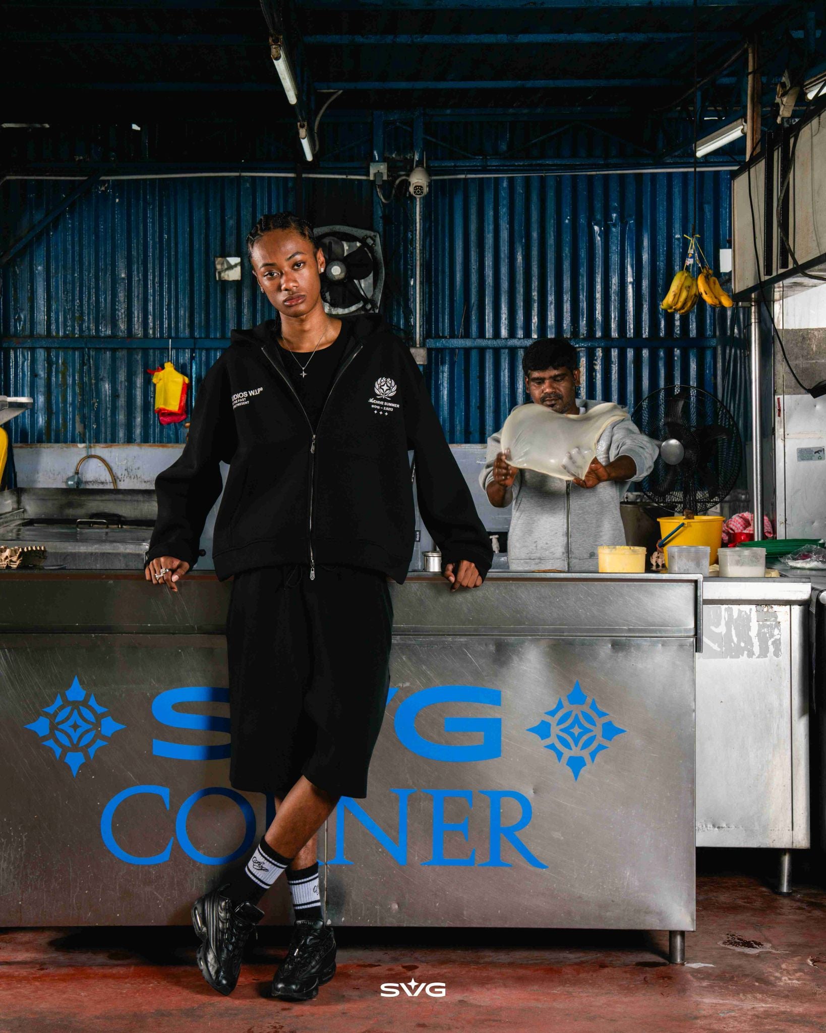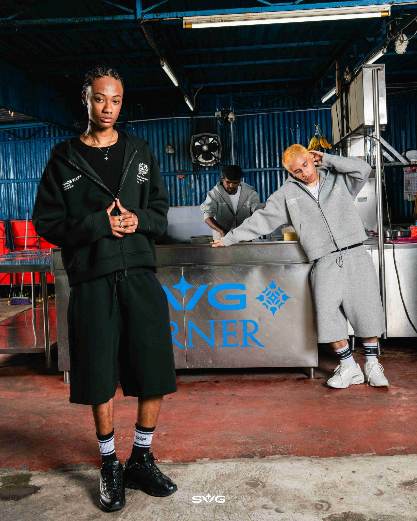 The SS26 WIP Zipper Hoodie features a heavyweight 350GSM polyester-cotton base, elevated with high-density printing and embroidered details, available in Black and Grey.